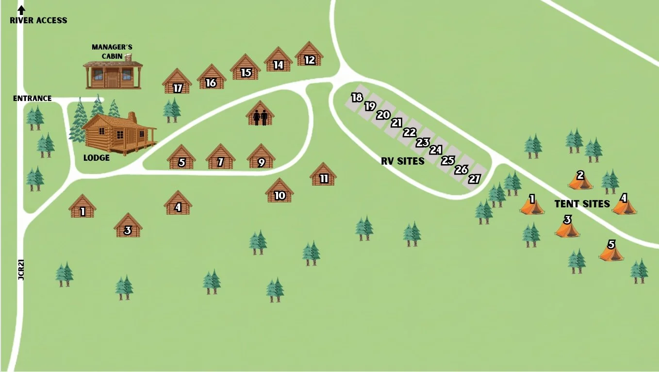 As you enter the campground, take your first right to drive in front of the Lodge & Dance Hall. Follow the road to find your cabin or RV site! Please drive clockwise around the loop (stay to your right) to help with traffic flow. If you are staying in a cabin, you may park off of the road in front of, or next to your cabin. Please call or text Lauren at (727) 430-0938 if you have questions or need assistance.
